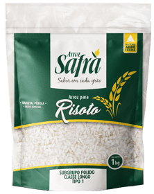 Arroz para risoto variável Pérola, disponível em embalagens de 1 e caixas de 10 embalagens.